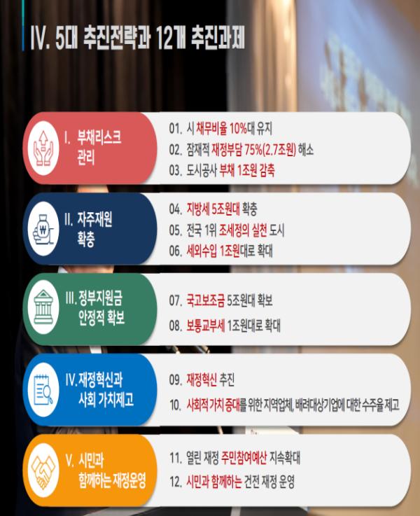 12대 주요 추진과제로는 시채무비율 10%대 유지, 잠재적 재정부담 75% 해소, 도시공사 부채 1조원 감축, 지방세 5조원대 확충 전국 1위 조세정의 실천 도시, 세외수입 1조원대 확대, 국고보조금 5조원대 확대, 보통교부세 1조원대 확대 재정혁신 추진, 사회적 가치 증대, 열린 재정 주민참여예산 지속 확대, 시민과 함께하는 건전 재정 운영 등이 포함되었으며, 시민과 전문가 등의 다양한 의견을 수렴하여 이를 토대로 실효성 있는 재정분야 중장기 계획을 운영할 예정이라고 밝혔다.