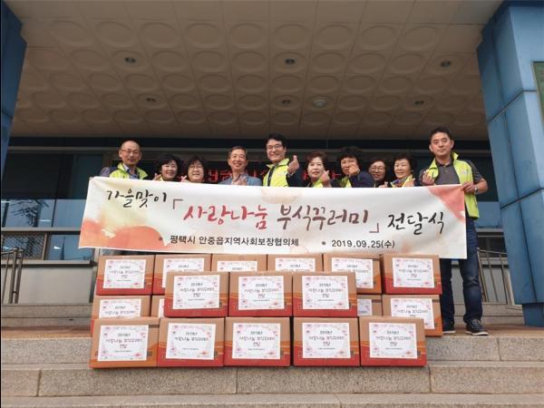 평택시 안중읍 지역사회보장협의체는 지난 25일 복지사각지대 및 경제적 어려움을 겪고 있는 소외계층 20가구를 대상으로 ‘사랑나눔 부식꾸러미’전달식을 가졌다.