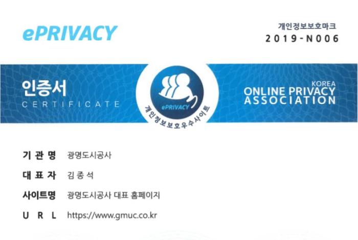 광명도시공사(사장 김종석)는 홈페이지를 대상으로 ‘개인정보보호 우수 사이트 인증(ePRIVACY)’마크를 취득했다.