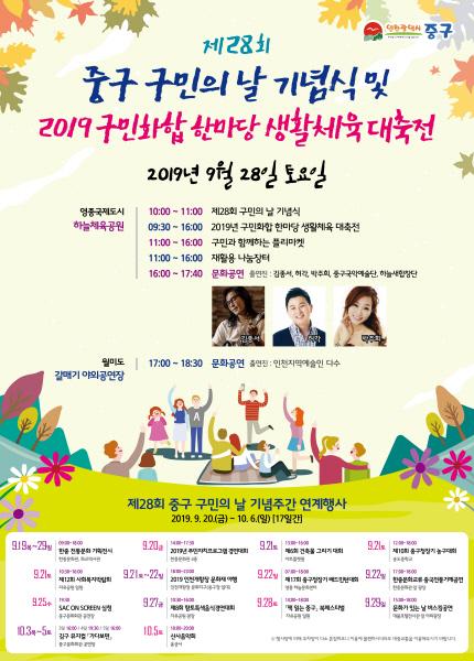 올해로 28회를 맞이하는 중구 구민의 날은 기념식과 구민화합 한마당 생활체육 대축전, 축하 문화공연으로 구성되었고, 이외에도 구민의 날 기념주간을 지정해 풍성한 연계행사가 펼쳐진다.