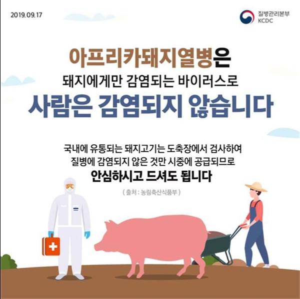 한편, 현재까지 해외 전문기구인 국제수역사무국에서도 아프리카돼지열병으로 인한 “인간 건강의 위협요소는 없다”고 했으며, 유럽식품안전국에서도 “인간은 아프리카돼지열병바이러스에 감수성이 없다”고 밝히고 있다.