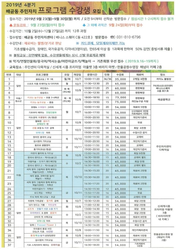 배곧동 주민자치위원회가 2019년 4분기 주민자치 프로그램을 개설하고 수강생을 모집한다.