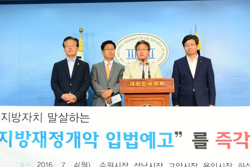| 4일, 국회 정론관에서 지방재정 개편 반대 공동성명서를 발표하는 채인석 화성 시장(사진 왼쪽에서 세 번째) (사진=화성시청 제공) |
