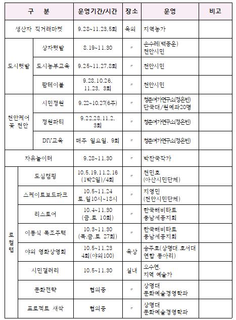 충청남도 15개 시·군 지역의 생산자와 소비자가 직접 만나 신선하고 건강한 먹거리를 믿고 소비할 수 있는 ‘생산자 직거래 장터’가 열려 시민 20여개 팀이 참가해 운영한다. 또, 천안지역 시민을 대상으로 ‘도시텃밭’ 운영자를 모집해 분양하고 도시농부 교육도 진행한다.