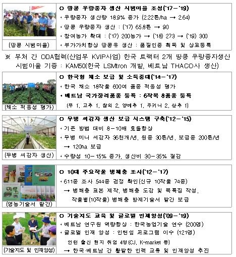 그 동안 베트남농업과학원과 총 16개의 농업기술 협력과제를 수행하면서 개발된 기술을 농가현장에 보급한 결과, 베트남의 농업 생산성과 농가소득 증가에 많은 도움이 됐다는 평가를 받았다.