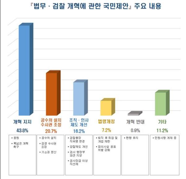접수된 총 1303건의 국민제안은, ① 검찰개혁 ② 공수처 설치와 검경수사권 조정 ③ 검찰 조직과 인사제도 개선 ④ 전관예우와 피의사실 공표 금지 등의 의견이 주를 이루었다.