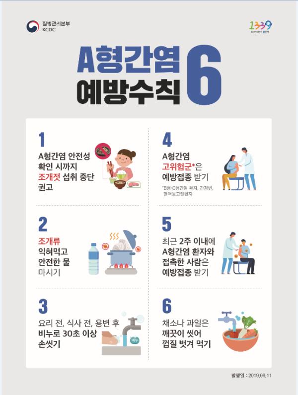 보건소는 A형간염 예방 및 전파 차단을 위해 준수해야 할 예방수칙으로 조개젓 섭취 중단, A형간염 고위험군 및 접촉자 예방접종, 조개류 익혀 먹기, 비누로 30초 이상 손 씻기, 채소류 등 씻어 먹기 등 6가지를 지켜 달라고 당부했다.