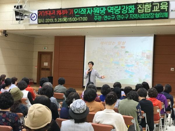 인천 연수구는 지난 26일 관내 13개동 지역사회보장협의체 위원 및 복지통장 등 명예사회복지공무원 170여명이 참석한 가운데 ‘생각해 본 적 없어 더 재미있는 일상’이라는 주제로 2019년 하반기 인적자원망 역량강화 교육을 실시했다.