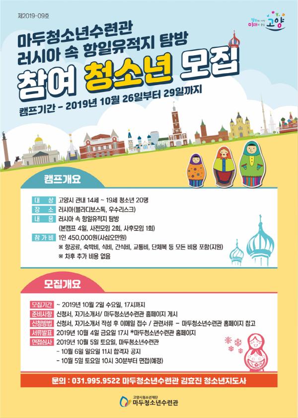 고양시청소년재단 마두청소년수련관에서 러시아 속 항일유적지를 탐방하는 ‘COREA URA’ 참가 청소년을 다음달 2일까지 모집한다.
