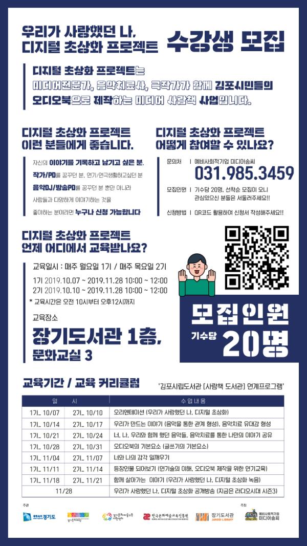 기수 당?20명?선착순?모집인?디지털?초상화?프로젝트?신청은?장기도서관 큐알코드를 활용하면?되며, 보다?자세한?사항은?시립도서관 홈페이지나 예비사회적기업?미디어솜씨로?하면?된다.