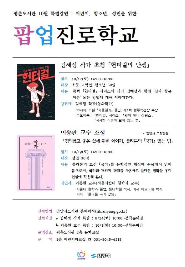 안양시립평촌도서관이 오는 10월 12일, 19일 이틀간 인문교양 특강 ‘팝업진로학교’를 개설하기로 하고 수강생을 모집한다.