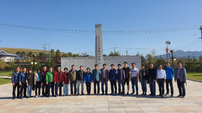 | 27일, 시 위원들이 북간도 독립운동의 요람인 명동촌에 있는 3.13운동기념비에서 참배하고 기념촬영을하고 있다.<사진= 화성시의회> |