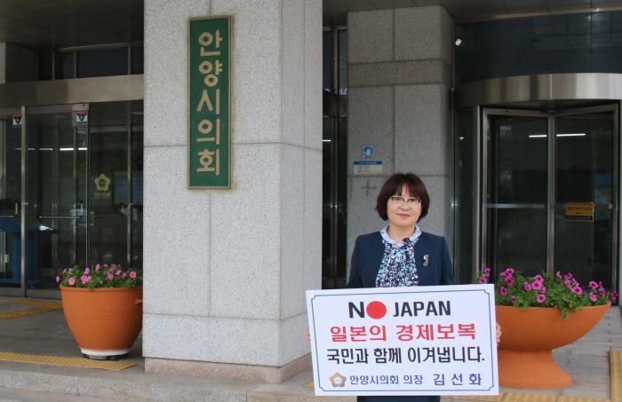 안양시의회 김선화 의장(사진)은 지난 27일 일본정부의 부당한 수출 규제를 규탄하는 캠페인인 '1일 1인 일본 규탄 릴레이 챌린지'에 동참했다.