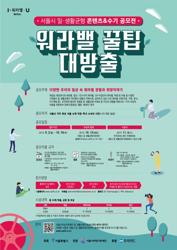 서울시여성가족재단은 일하는 부모 청년·1인가구 직장인 학생 아동 어르신 등 다양한 시민들의 ‘워라밸’ 이야기를 모집한다. 일과 생활의 균형이 어려웠지만 이를 극복했던 사례, 모두에게 필요하다고 생각되는 성평등 일·생활균형 미래상 등 자신의 경험을 바탕으로 ‘워라밸’ 관련 동영상, 웹툰, 수기 콘텐츠를 제작하면 된다.
