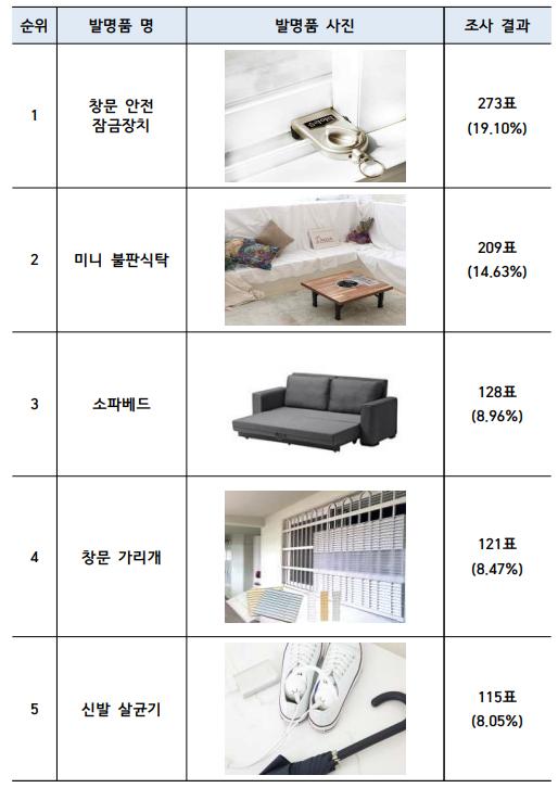 나홀로족을 위한 발명품 2위는 미니 불판식탁, 3위는 소파베드, 4위는 창문 가리개, 5위는 신발 살균기가 차지하는 등 나홀로족의 안전과 식생활에 필요한 상품들이 상위권에 선정됐다.