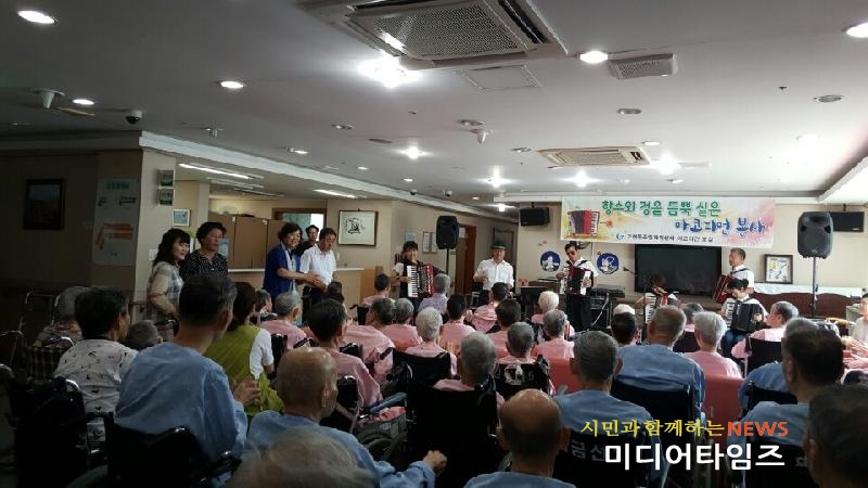 [미디어타임즈 = 최귀복 기자] 거제시 고현동 주민자치센터(위원장 임춘식) 아코디언 교실은 지난 7일, 거제면에 소재한 노인요양원 ‘정원’에 방문하여 다과를 전달하고 ‘향수와 정’을 실은 아코디언 봉사 활동을 실시했다.