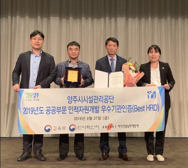 양주시시설관리공단은 지난 27일 인적자원개발 우수기관 인증에 선정되는 영예를 안았다.