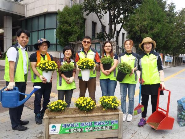 평택시 비전2동 주민자치위원회는 지난 27일 주민자치위원 및 마을주민 등 20여명이 참석한 가운데 ‘아름다운 마을 만들기 사업’일환으로 시내 곳곳에 국화 총 400본을 식재했다.