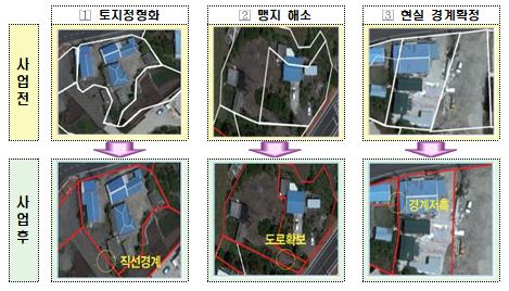 지적재조사 사업은 현실 경계에 부합하도록 경계를 확정하고, 토지를 정형화하며, 지적공부상 맹지를 해소하는 등 개인의 재산권 제약 문제들을 해소하는 효과가 있다.