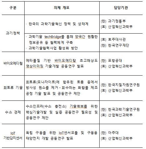 이번 과기공동위에서 양국은 4차 산업혁명의 급격한 변화에 대응한 기술협력 강화의 필요성에 공감하고, 수소경제, 희토류, 인공지능 등 10대 기술분야에서 협력하는 테크 브릿지 이행방안 논의, 한-호주 과학의 날 개최에 합의했다.