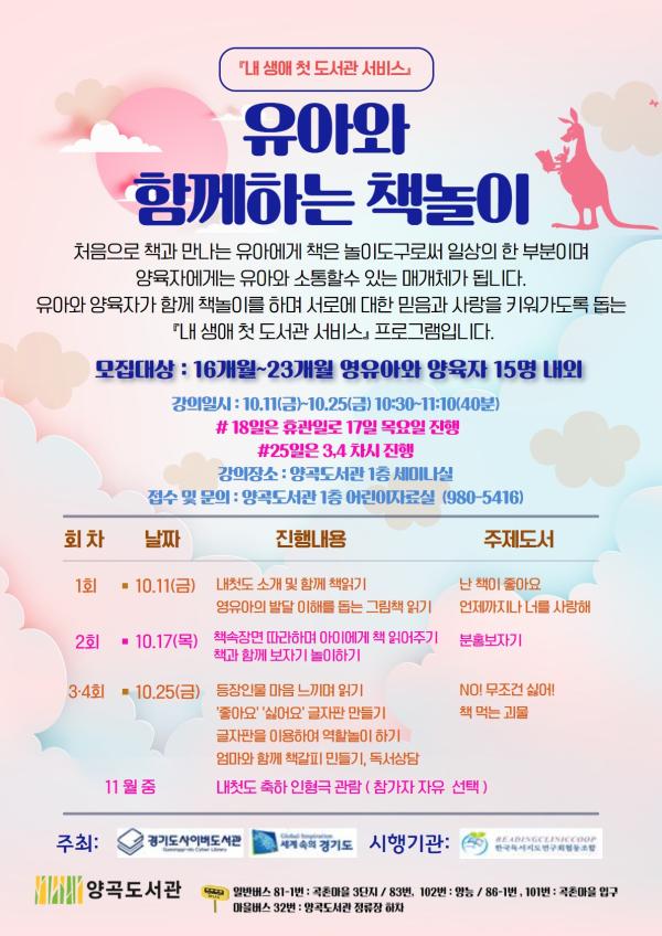 김포시 양곡도서관은 오는 10월 11일부터 유아와 양육자가 함께 하는 ‘내 생애 첫 도서관 서비스’ 특강을 4회 과정으로 운영한다.