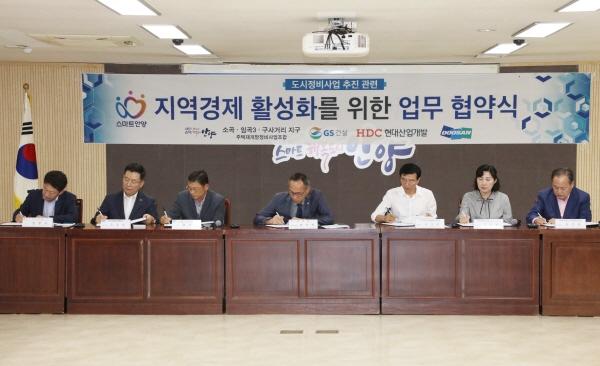 30일 안양시청 상황실, 안양시와 소곡·임곡3·구사거리지구 주택재개발정비사업조합, 이 일대 재개발사어을 추진 중인 3개 건설사〔, HDC현대산업개발, ㈜두산건설〕등 7자간 업무협약이 체결됐다.