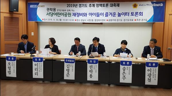 경기도와 경기도의회가 공동주최하고 있는 ‘2019년 경기도 추계 정책토론 대축제’가 30일 오전 10시 30분 도의회 도시환경위원회 권락용 의원이 좌장을 맡아 성남시 서현2동 행정복지센터 회의실에서 ‘서당어린이공원 재정비와 아이들이 즐거운 놀이터’를 주제로 열띤 논의를 이어나갔다.