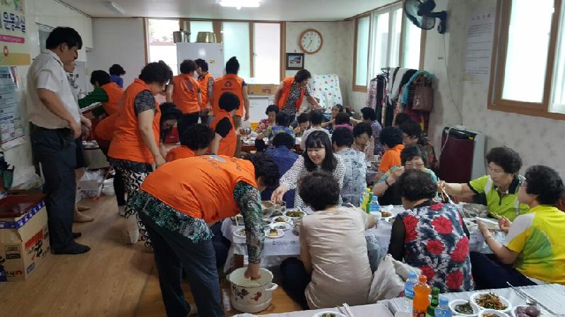 이날 중식 봉사활동에는 무더위를 이겨낼 보신용 삼계탕과 떡, 과일, 다과 등 정성껏 준비한 음식으로 대접하였으며, 더위를 식혀 줄 선풍기도 2대 기증하였다. 봉사대원들은 어르신들의 건강과 안부를 물으며 담소를 나누는 등 어르신들과 한때 즐거운 시간을 보냈으며, 삼계탕을 드신 어르신들은 “보신을 하고 나니 힘이 나서 올 여름 무더위는 거뜬히 넘기겠노라” 약속하시며 흐뭇해 하셨다.