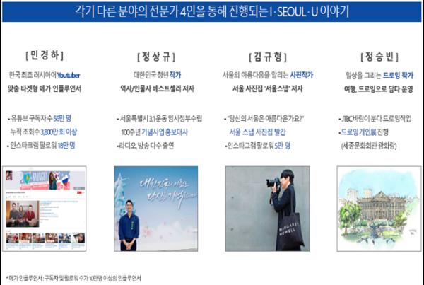 ‘I·SEOUL·U 평화사절단’은 러시아 현지에서 한국을 주제로 한 콘텐츠로 팔로워 60만 명을 보유한 러시아 전문 유튜버 ‘민경하’, ‘잊혀진 독립 운동가’의 저자이자 독립운동가 앱을 개발한 작가 ‘정상규’, 서울 사진집 ‘서울스냅12’를 출간해 서울의 아름다움을 알리고 있는 사진작가 ‘김규형’ 여행전문 드로잉 작가 ‘정승빈’으로 구성됐다.