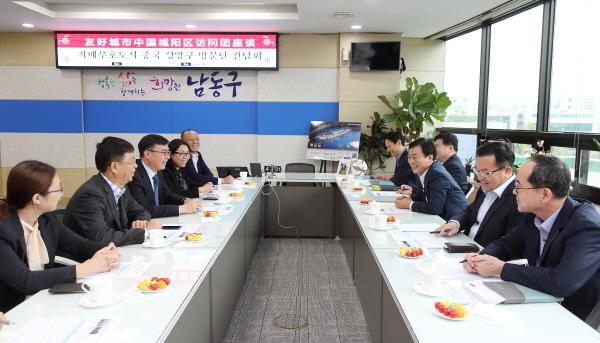 이강호 남동구청장이 지난달 27일 남동구청에서 중국 청도시 성양구 방문단 일행을 맞이해 간담회를 가졌다.