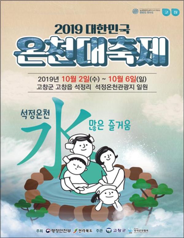 행정안전부는 오는 2일부터 6일까지 ‘온천으로 떠나는 따뜻한 가족 힐링 여행’을 주제로 전라북도 고창군 석정온천관광지에서 2019년 대한민국 온천대축제를 개최한다.