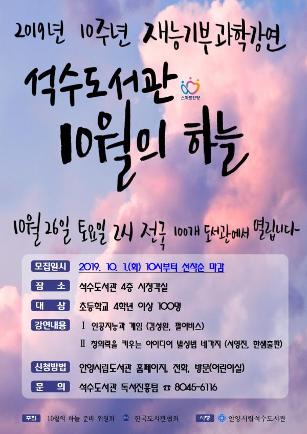 안양시 석수도서관과 박달도서관이 오는 26일 ‘10월의 하늘’ 강연회를 열기로 하고 참석자 100명을 모집한다.
