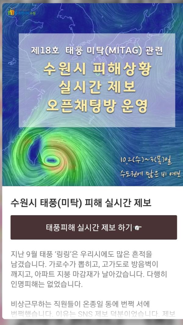 수원시는 9월 30일 ‘수원시 카카오톡 친구’ 43만 3000여 명에게 태풍 관련 제보를 할 수 있는 메시지를 전송한 바 있다. 메시지 화면에서 ‘태풍 제보’를 검색하면 오픈 채팅방으로 연결된다.