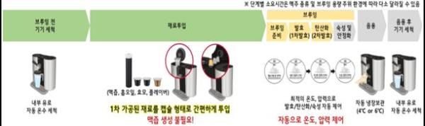 캡슐과 물을 넣고 간단한 다이얼 조작만 하면 1~4주 후 자동적으로 5L의 신선한 수제맥주가 만들어지는 수제맥주 제조기기