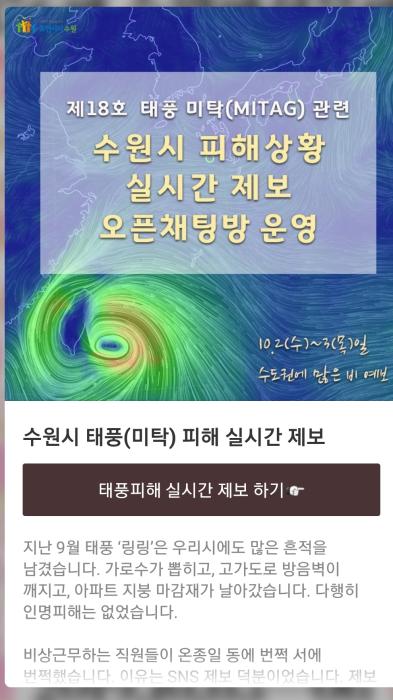 수원시가 제18호 태풍 ‘미탁’ 북상으로 태풍 주의보·경보가 발령되면 누구나 참여할 수 있는 ‘카카오톡 오픈채팅방’을 운영해 실시간으로 피해 제보를 받고, 시민들에게 정보를 공유한다.