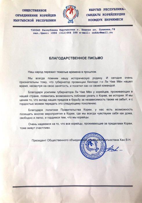 경기도지사 이재명 지키기 범국민대책위원회(이하 이재명범대위)는 키르기스스탄 고려인 연합회 한 베차슬라브외 고려인 회원이 이재명 지사의 탄원서를 보내왔다고 2일 전했다.