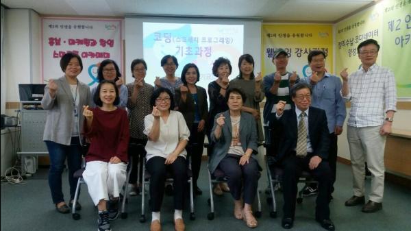 교육을 진행한 안정희, 정경자, 김경아 코딩 전문 강사는 “운전면허나 영어처럼 코딩도 필수인 시대가 올 것이다. 미국에서는 수학, 과학 등 기초 학문과 코딩을 제대로 가르치기 위해 부족한 인력을 시니어를 활용하고 있다고 한다. 코딩을 앞서 접한 것은 축하할 일이고 전망도 밝은 편”이라고 수료를 축하했다.