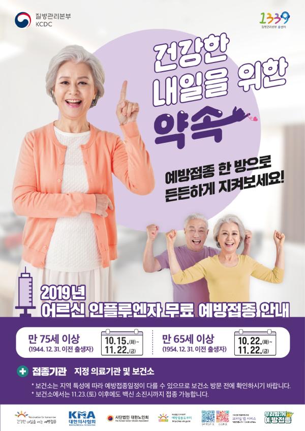 만 65세 이상 어르신은 접종 쏠림을 예방하기 위해 만75세 이상은 10월 15일부터 11월 22일까지 만65세 이상은 10월 22일부터 11월 22일까지 지정 의료기관에서 접종을 시작한다.
