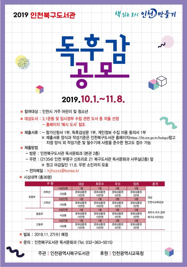 인천광역시북구도서관은 독서하기 좋은 계절 가을을 맞이하여 ‘3.1운동 및 임시정부수립 100주년기념’ 독후감을 공모한다.