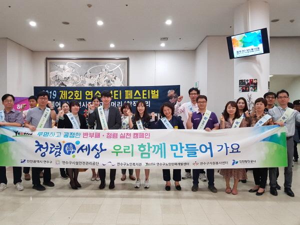 연수구는 지난 1일 구청 연수아트홀 및 구청 앞 사거리에서 오후 5시부터 6시 30분까지 연수구민과 직원을 대상으로 ‘2019년 청렴실천캠페인’을 실시했다.