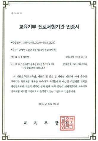 농촌진흥청은 ‘교육기부 진로체험 인증기관’으로 선정돼 지난달 30일 농업생명자원부에서 현판식을 가졌다.