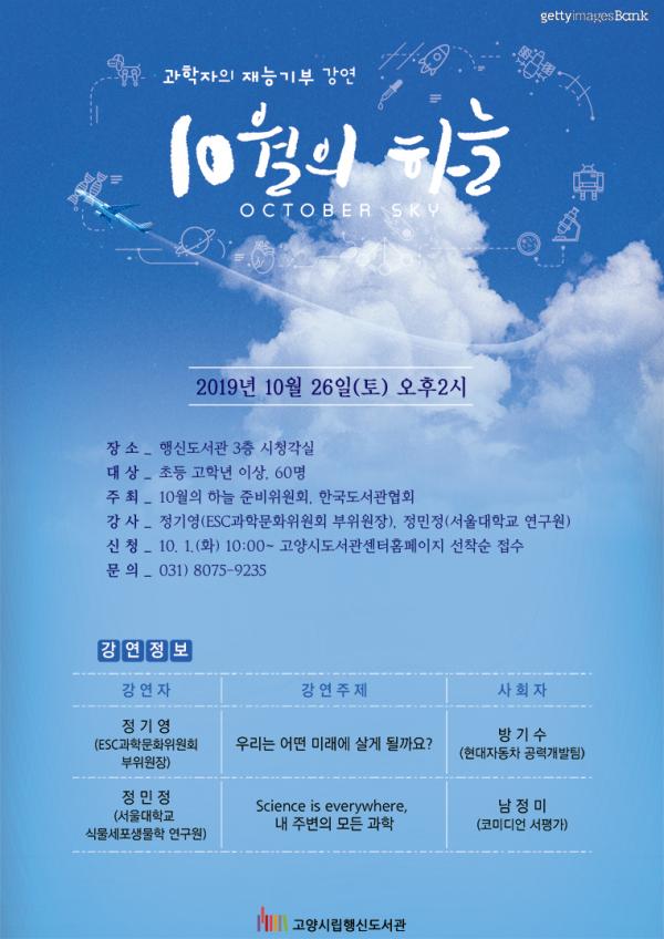 고양시 행신도서관이 오는 26일 과학자들의 재능기부 과학강연행사인 ‘10월의 하늘’을 개최한다.