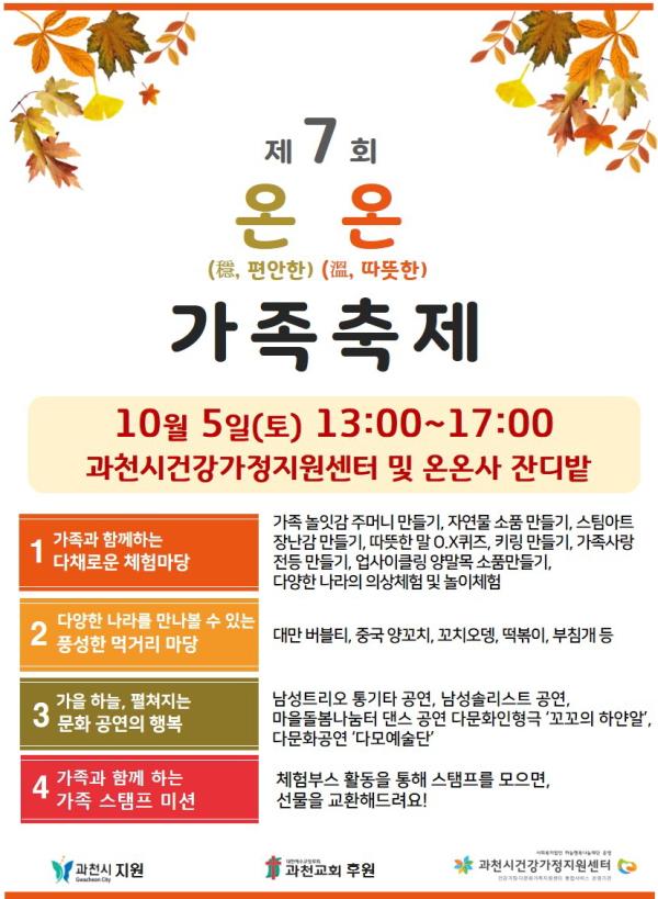 과천시건강가정지원센터 주관으로 열리는 이날 행사는 오후 1시부터 시작되며, 과천시민이면 누구나 참여 가능하다.