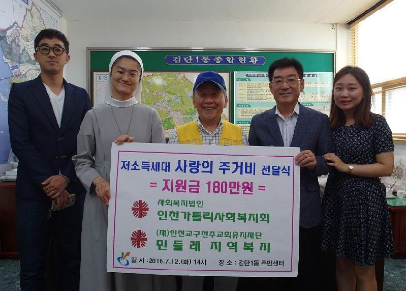 [미디어타임즈=문상수 기자]인천광역시 서구 검단1동 주민센터(동장 민 구)는 지난 12일 사회복지법인 인천가톨릭 사회복지회(회장 이상희 신부), 민들레지역복지(대표 이효민 신부)와 함께 관내 저소득 세대에게 사랑의 주거비 180만원를 지원하였다. 주거비를 지원 받은 이모씨는 장애를 지니고 가족 없이 홀로 지내며 몇 년의 기다림 끝에 LH한국토지주택공사에서 시행하는 매임세대 주택에 선정되었지만, 현재 거주하던 주택의 보증금 200만원이 전 재산이었으므로 400만원 가까이 되는 보증금 마련이 쉽지 않아 매입임대주택 입주를 포기해야 되는 상황이었다. 이런 딱한 사정을 접한 검단1동 주민센터와 민들레지역복지, 인천가톨릭사회복지회는 부족한 보증금 180만원을 지원하였다. 몇 년을 기다려왔던 매입임대 주택의 입주가 보증금 마련의 어려움으로 포기될 뻔 하였으나, 민·관이 신속하게 협력하여 지원하므로 꿈에 그리던 매임주택에 입주하게 된 이모씨는 고 소감을 전했다.이날 전달식에 참여한 인천가톨릭사회복지회 마리아카페 수녀님은 항상 최일선 현장에서 복지 민원을 접하는 동주민센터에서 여러 위기 사항으로 곤경에 처한 대상자들을 적극적으로 발굴하여 의뢰해주므로 좋은 일에 동참할 수 있도록 해주신 것에 대한 감사의 마음을 전하자, 민구 검단1동장은 민들레지역복지와 인천가톨릭사회복지회에서 지역사회에 좋은 자원 기관으로 많은 도움을 주는 것에 감사의 뜻을 전하였다.