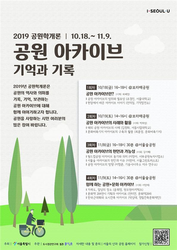 프로그램은 공원 및 아카이브 분야의 전문가의 발제 후 발제자와 청중이 함께 담론을 나누는 순서로 구성했다. 10월에 1~2회차, 11월에 3~4회차가 진행되며 매회 약 50명씩 2시간 내외로 소요될 예정이다.