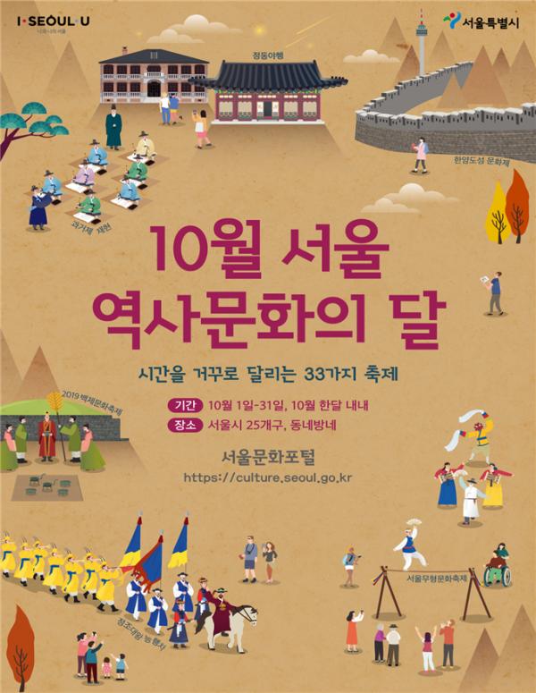 서울시는 가을철에 집중된 역사문화 행사들을 통합 안내하여 보다 많은 시민들과 함께 할 수 있도록 올해부터 ‘10월 서울 역사문화의 달’을 운영한다. ‘시간을 거꾸로 달리는 33가지 축제’라는 슬로건으로 행사/축제 학술회의 전시 체험/탐방 등 4가지 분야별 다채로운 행사가 펼쳐진다.