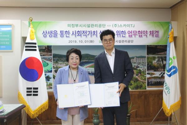 의정부시시설관리공단은 지난 1일 ㈜스카이TJ와 ‘생활폐기물 공동주택 판매처 사업’ 확대를 통해 민관 상생하여 사회적 가치를 실현하기 위한 업무협약을 체결했다.