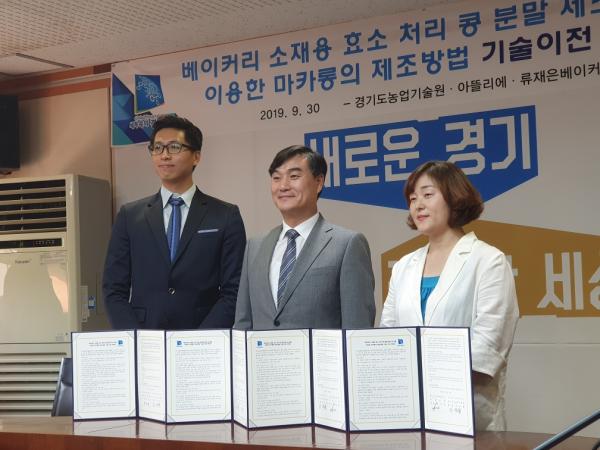 파주시 관내 베이커리 업체인 류재은베이커리와 아뜰리에 마카롱은 지난 9월 30일 경기도농업기술원이 개발한 ‘베이커리 소재용 효소 처리 콩 분말 제조 및 이를 이용한 마카롱의 제조방법’에 대한 기술이전 계약을 체결했다.