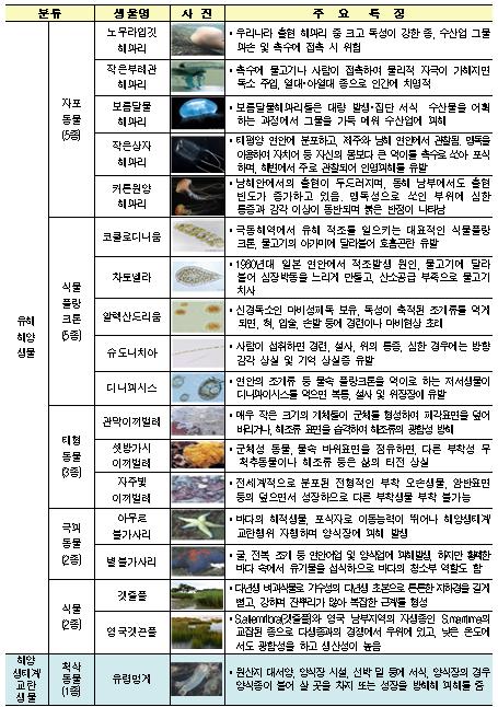 해양수산부는 우리 해양생태계를 교란시키는 생물에 대한 관리를 강화하기 위해 ‘해양생태계 교란생물 및 유해해양생물 지정·관리 등에 관한 고시’를 개정하여 오는 7일부터 시행한다.