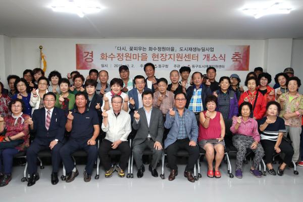 화수정원마을 도시재생현장지원센터는 제물량로 424, 2층에 조성됐으며, 지난 2일 허인환 동구청장 및 주민 70여명이 참석한 가운데 주민화합의 장이 될 도시재생현장지원센터의 개소를 모두 한마음으로 축하했다.
